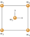 In Figure 13-34, a square of edge length 22.0 cm is formed by four spheres of masses m1 = 7.00 g, m2 = 3.50 g, m3 = 1.50 g, and m4 = 7.00 g. In unit-vector notation, what is the net gravitational force from them on a central sphere with mass m5 = 2.30 g?
